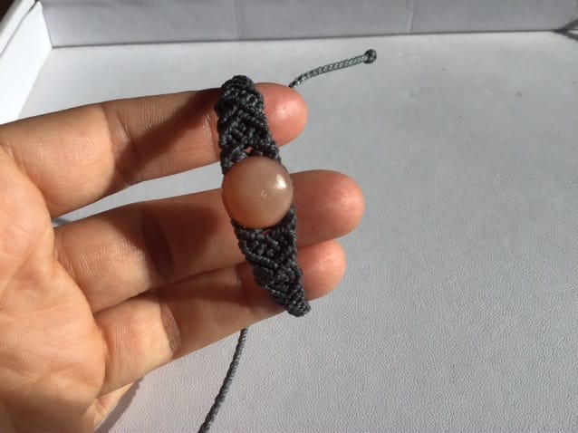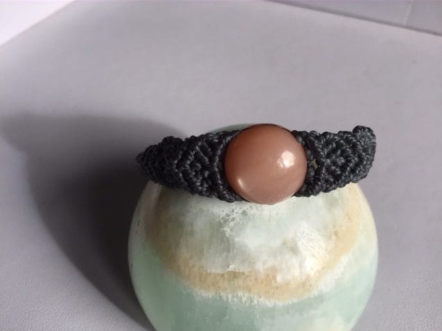 Bracelet en pierre de lune pêche, réalisé selon la technique du rainurage mexicain. Le fil de polyester ciré est fortement serti autour de la pierre, nous obtenons un bracelet costaud et durable dans le temps. Le polyester ciré peut aller dans l’eau, il résiste bien plus que le coton ou le lin.