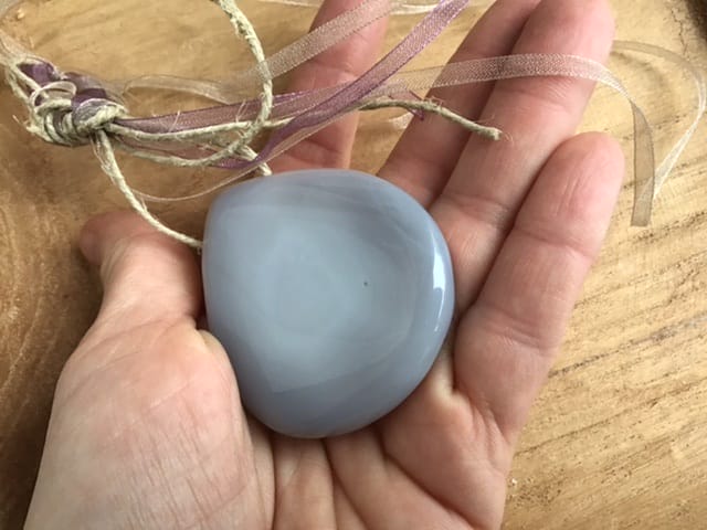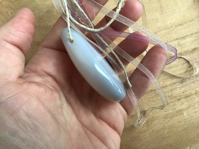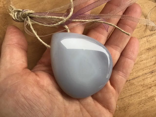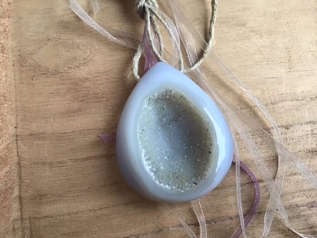 Cette belle calcédoine naturelle druzy est percée de part en part. Une ficelle, permet à ce qu’ elle soit suspendue.
