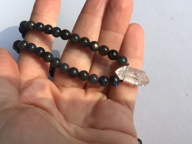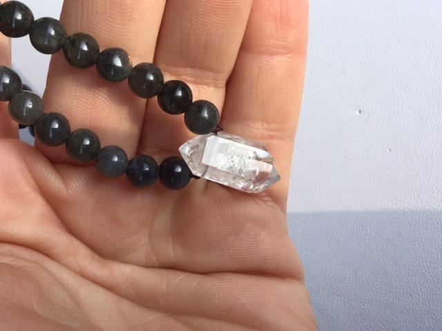 Collier tout en perles de labradorite aux reflets bleus, jaunes, verts, orangers selon les perles, et un quartz du pakistan biterminé d’environ 2,5cm – perles labradorite de 6mm – longueur du collier déplié: 43cm