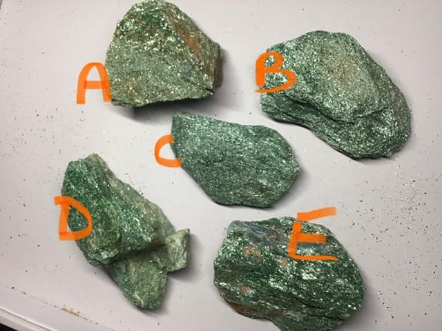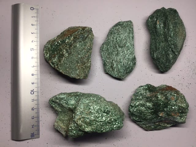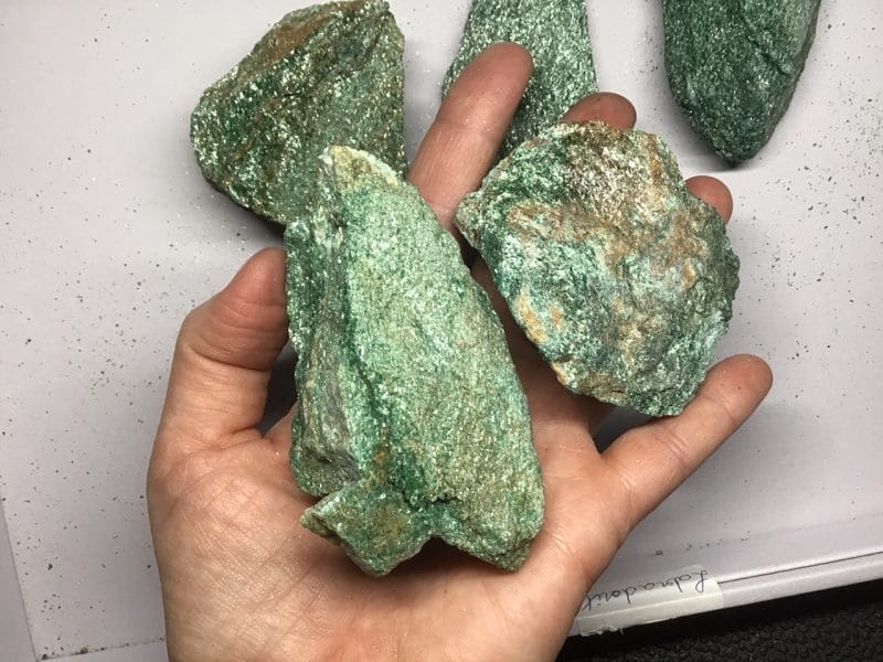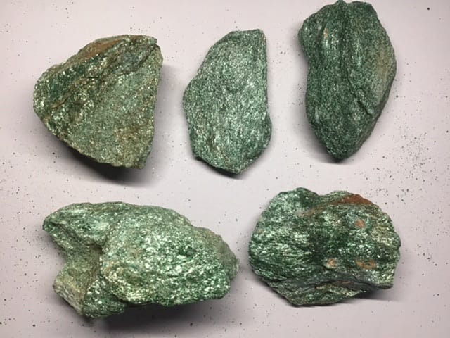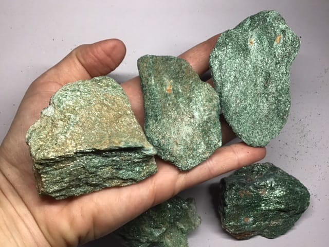 Fuchsite brute du Brésil, pierre superbe, brillante, qui s’effrite, c’est normal!