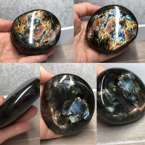 Labradorite de Madagascar de couleur orange, noir, jaune, feu, bleu
