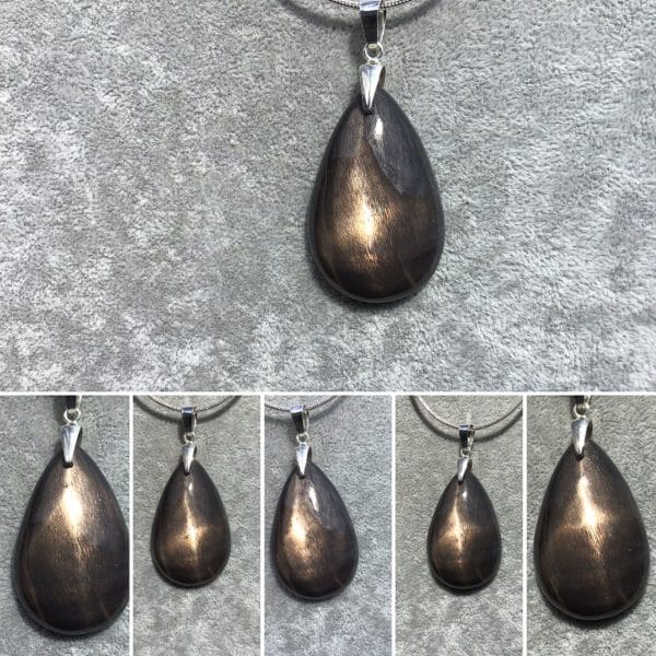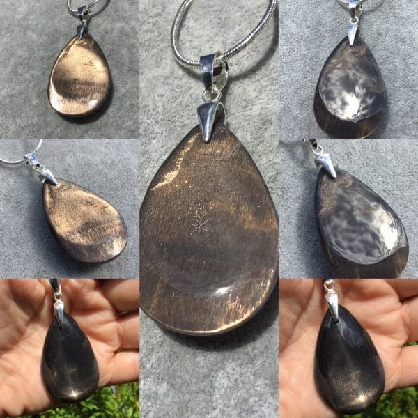 Cette goutte de pierre de soleil est en fait de la superbe pierre de lune noire dotée de paillettes d ‘ hématite, d’où l appellation pierre de soleil.