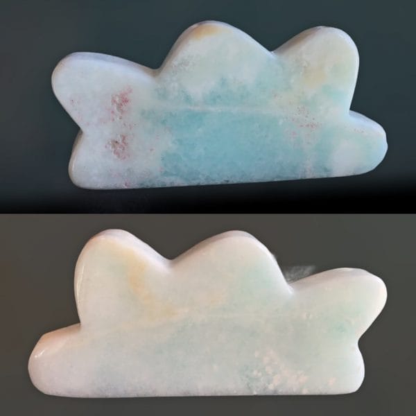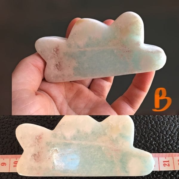 Nuage en calcite bleue d’ Afghanistan, au choix 2 nuages, à noter pour le plus gros : les traces rouges sont des petites incrustations de pate à polir & présence d’un léger accroc