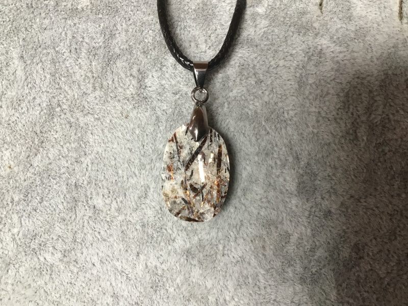 Un pendentif astrophyllite naturelle très original, taillé sur mesure pour notre plus grand plaisir ! La face brute a de superbes reflets, en video dans la galerie photo.