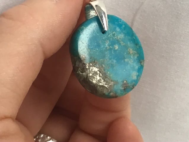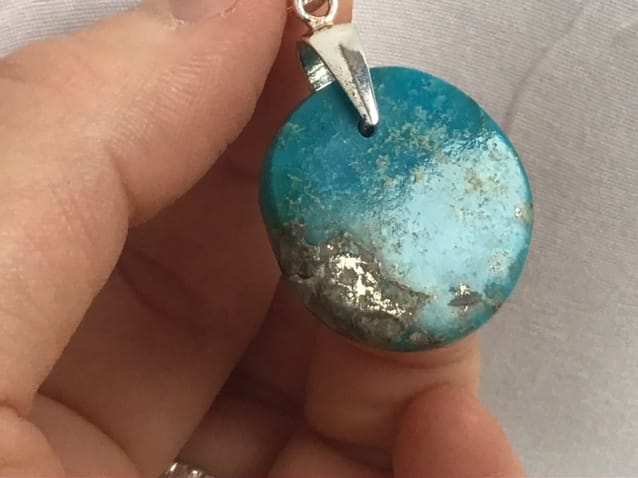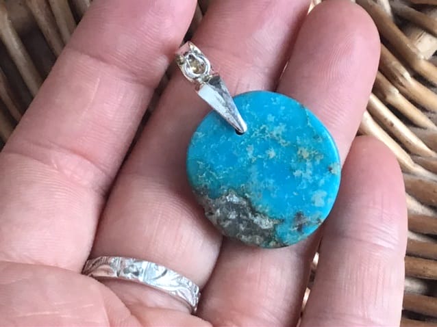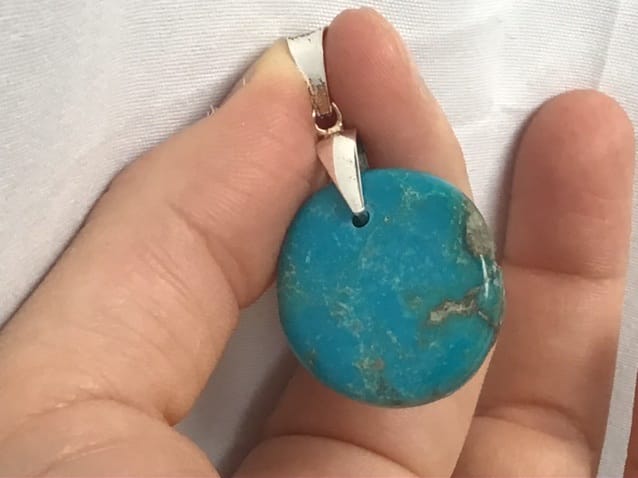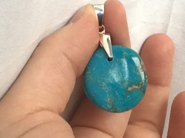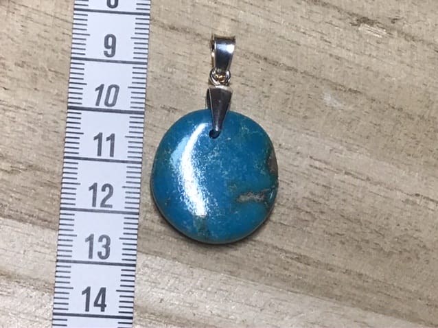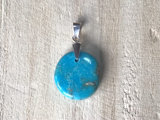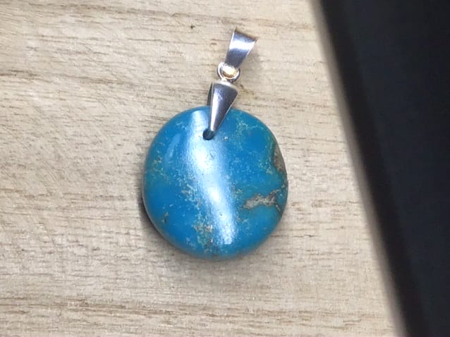 Pendentif rond turquoise naturelle d’ Arizona avec bélière en argent 925 dont la turquoise pèse 8,10gr. Le poids total du pendentif est de 9,28gr,