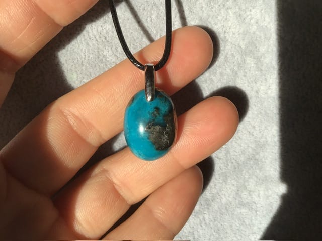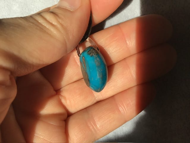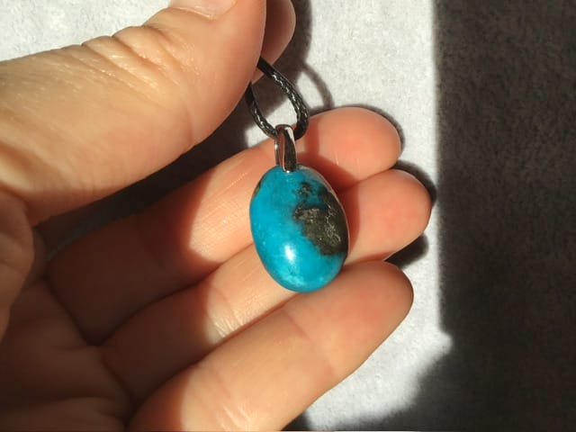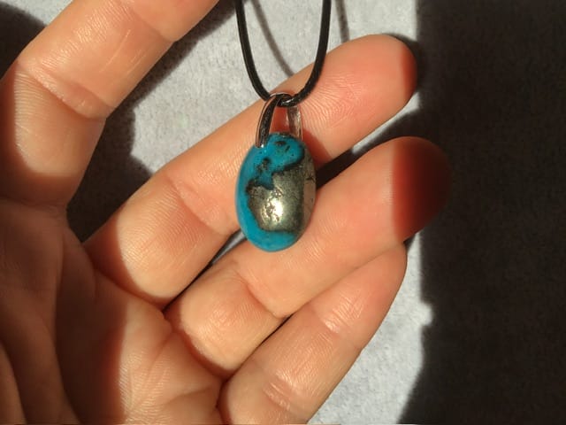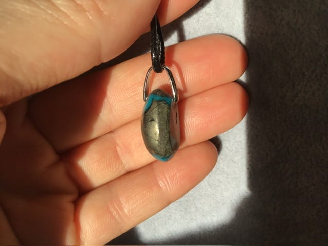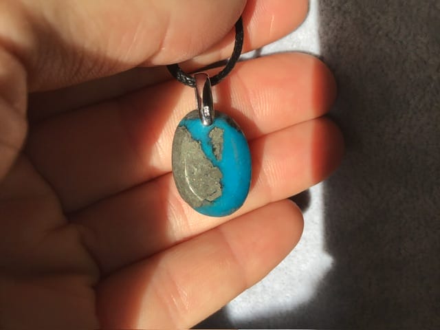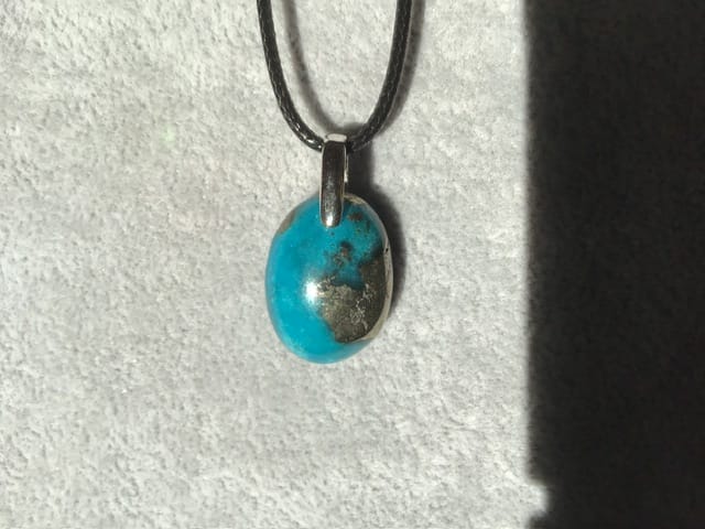 turquoise naturelle typique d’ Iran avec ses inclusions de pyrite d’une superbe qualité, en video dans la galerie photos