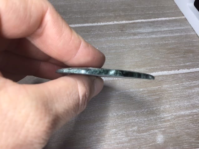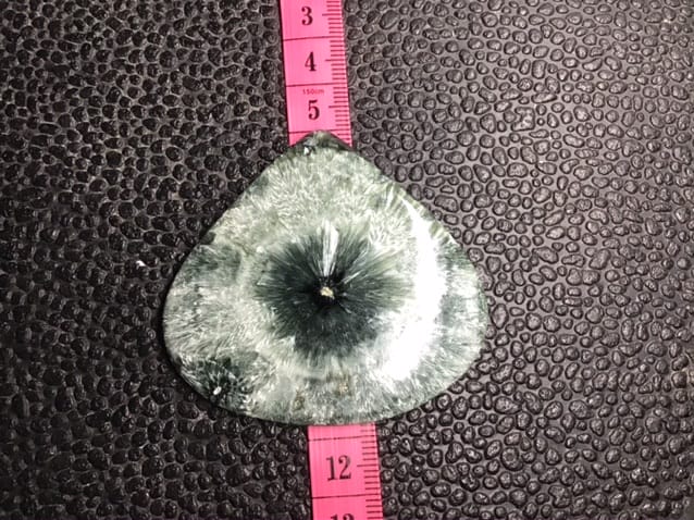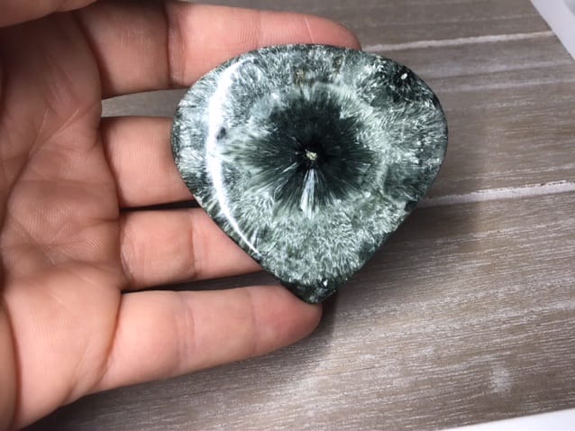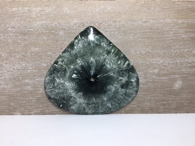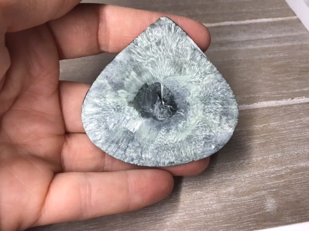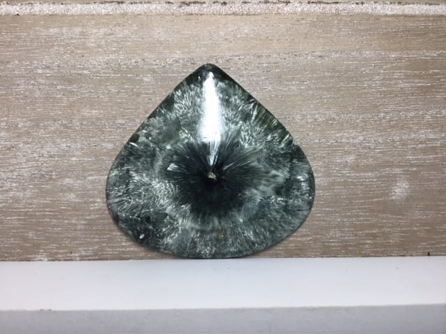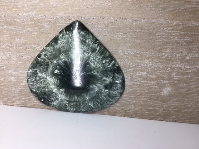 Cabochon assez fin env 4 mm de seraphinite = clinochlore en forme de large goutte aux superbes motifs
